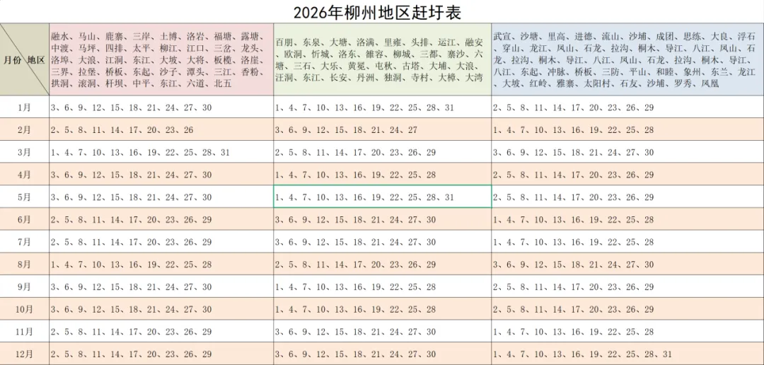 柳州人的快乐,一半藏在螺蛳粉里,一半藏在“赶圩”里!2026年柳州地区赶圩表新鲜出炉,从柳北到柳南,从柳江到柳城,从武宣到融水,全年的圩日都给你安排得明明白白!小编对照这份赶圩表,把柳州的宝藏圩镇、隐藏美食扒拉出来了,周末照着冲,保准吃撑还能扛满土货回家!