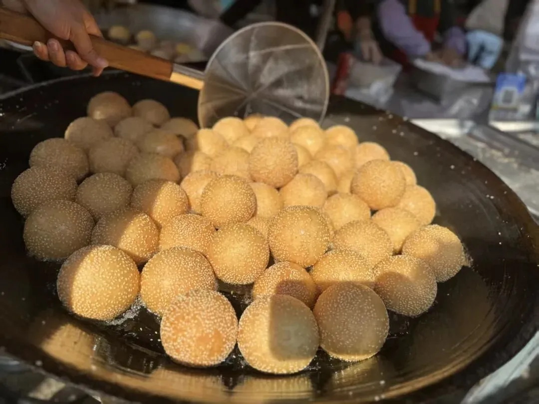 粉摊旁边的麻圆摊,刚炸好的麻圆裹满芝麻,咬开是空心的糖心,甜香混着油香,配螺蛳粉刚好中和辣味,小编直接连炫2个(别问,问就是嘴停不下来)。