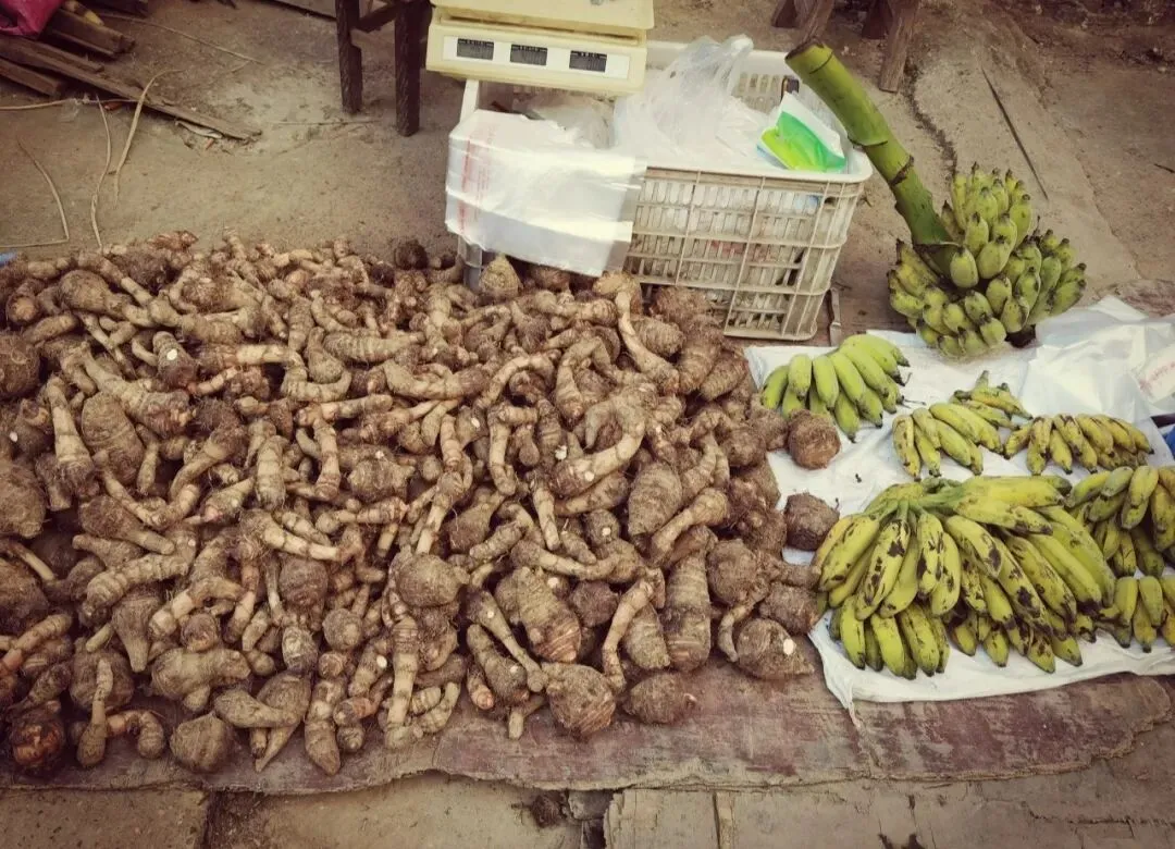 吃完粉赶紧去买土货,旁边吃粉的阿姨已经大包小包堆满了桌面,麻圆真买了不少。新鲜的芋头带着泥土的芳香,鲜黄的野菊花带着乡间的野味,拿来拍照巨好看。走一圈下来,手里也是大包小包的,满载而归。
