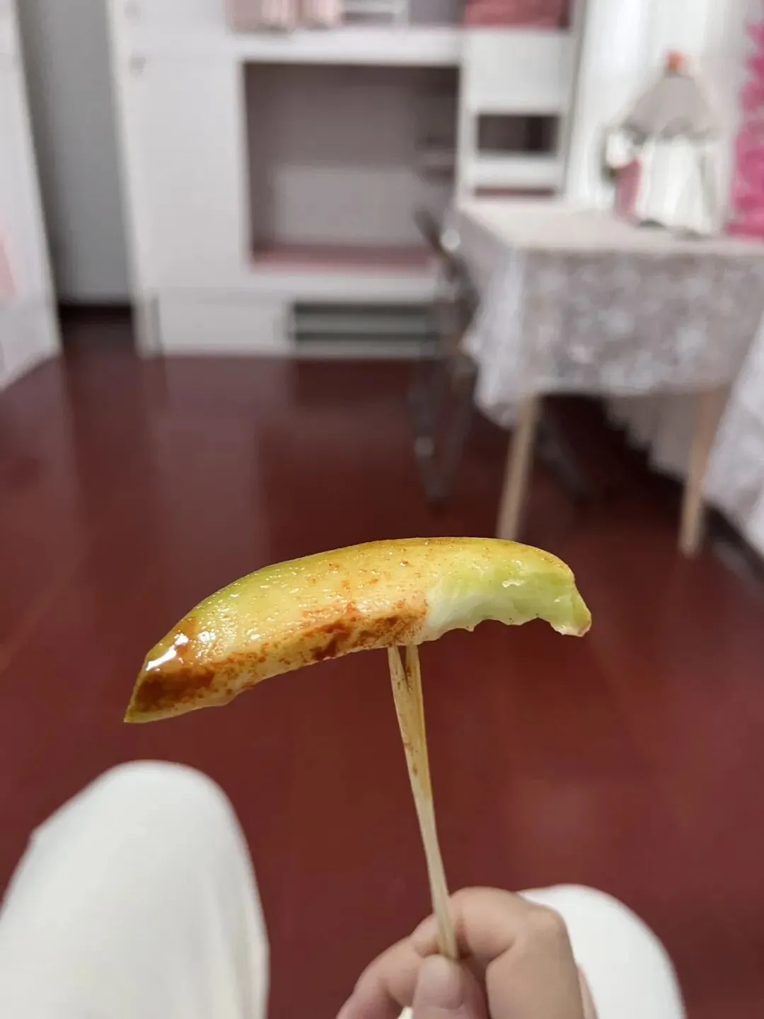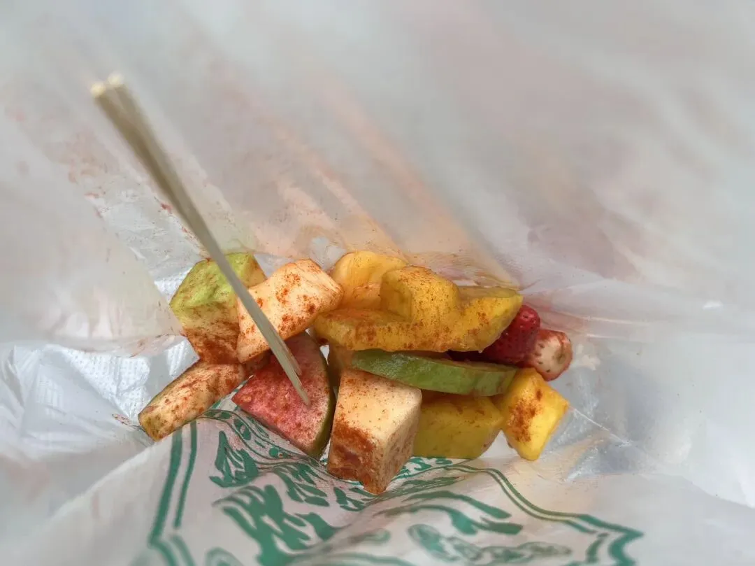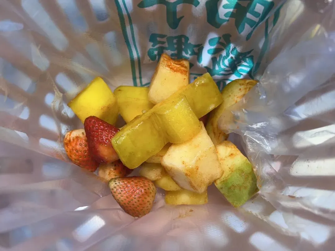 这个口感实在是吃不惯。辣椒面裹在水果上,渗透到果肉里,酸甜中又带着咸辣味。