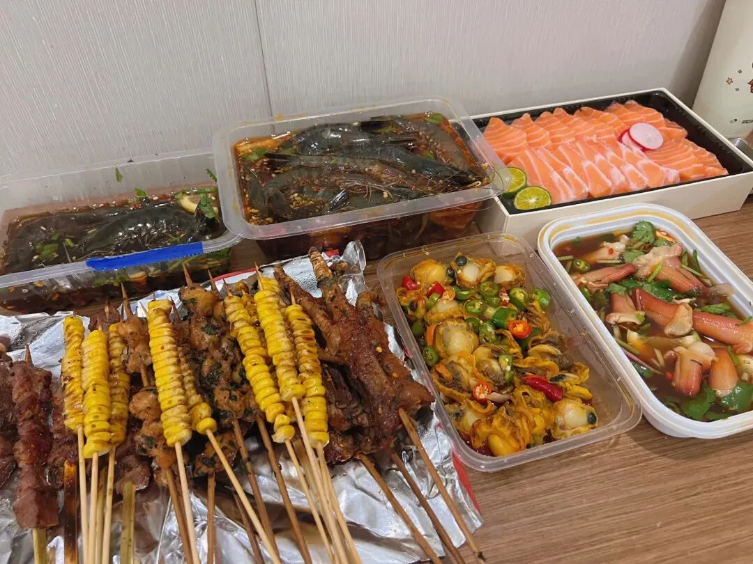 辣卤海鲜和烤串。