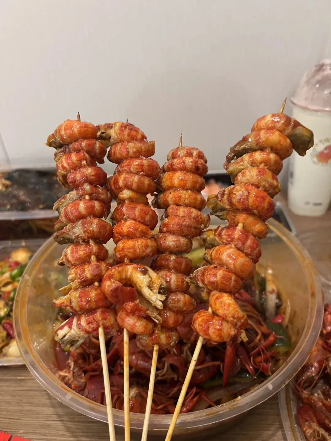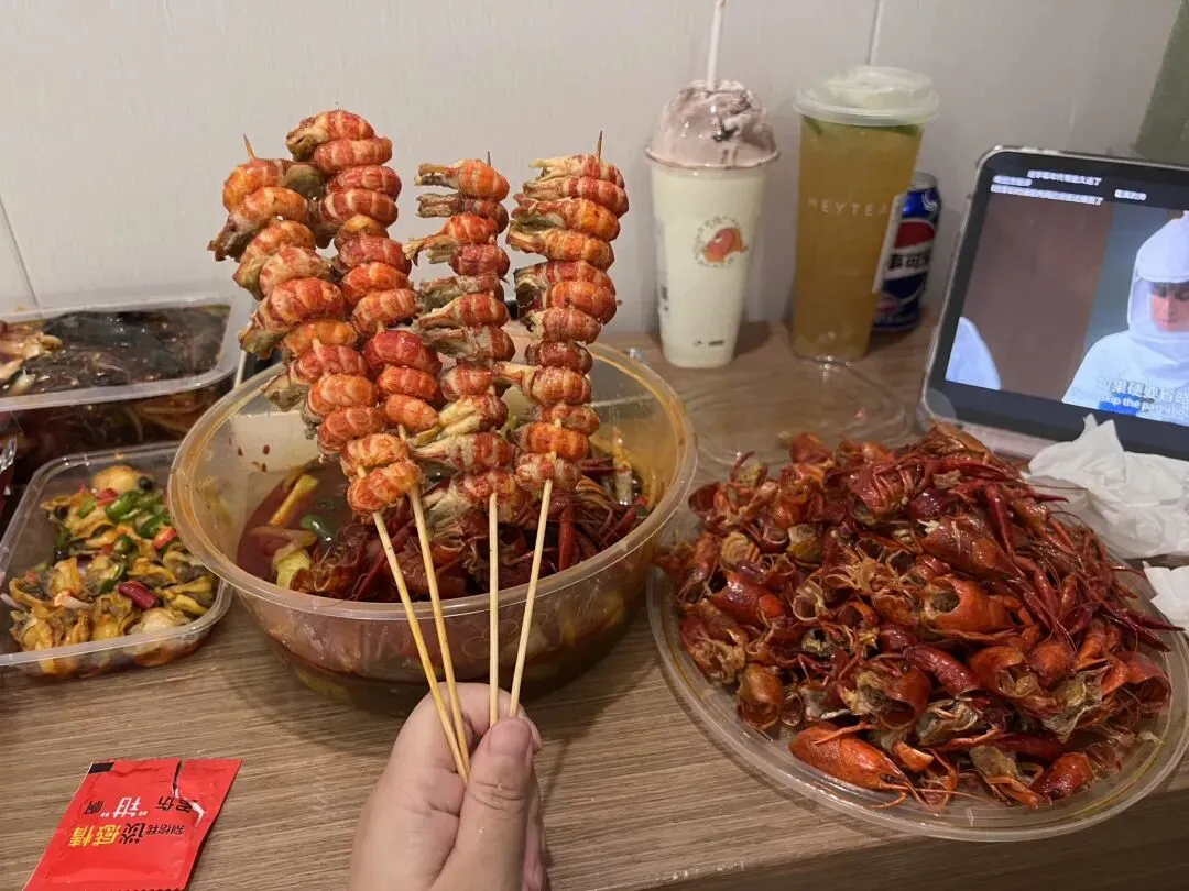 点了一份小龙虾,决定像网红吃播那样吃一次。这一盒小龙虾剥了整整半个小时,才串了四串出来,看着好有食欲。