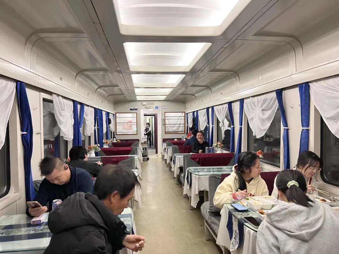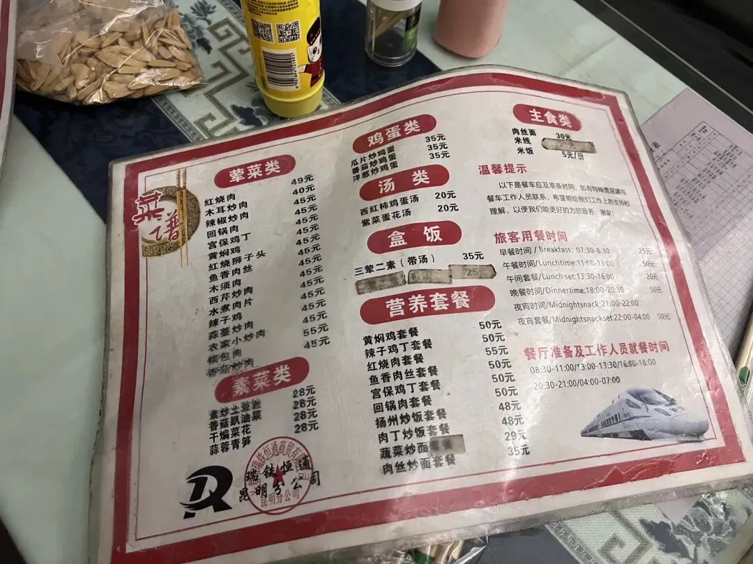 听说火车上的菜真的是现炒的,价格好像也不贵。下次可以试试不带泡面,来餐厅车厢坐下来吃盒饭。