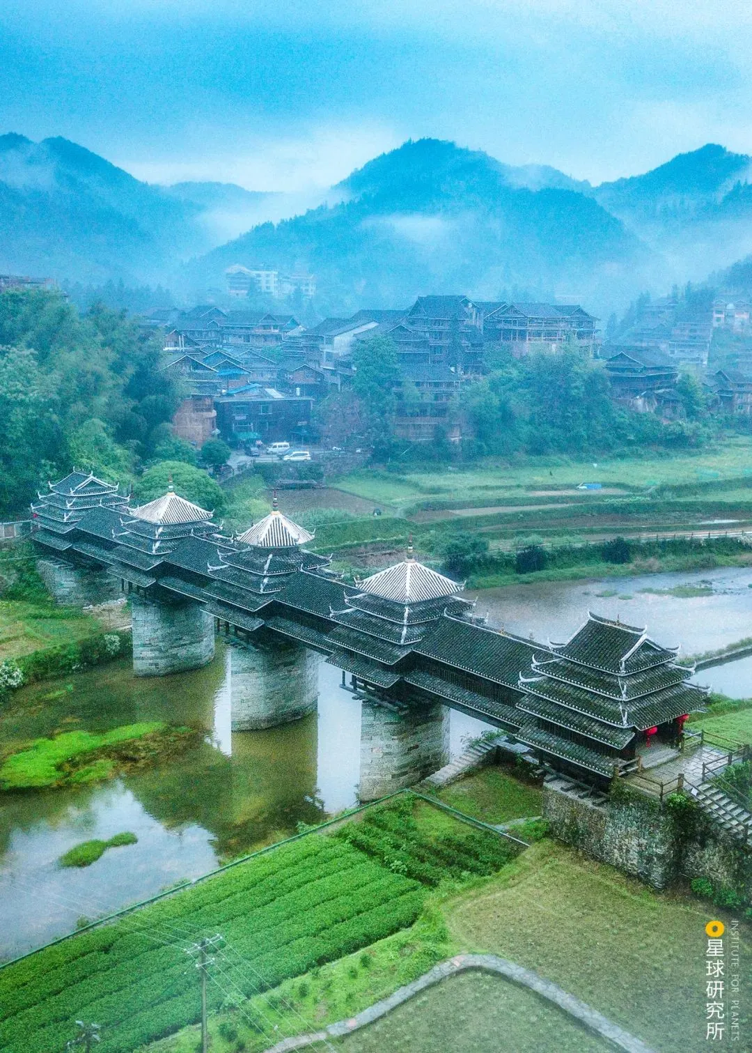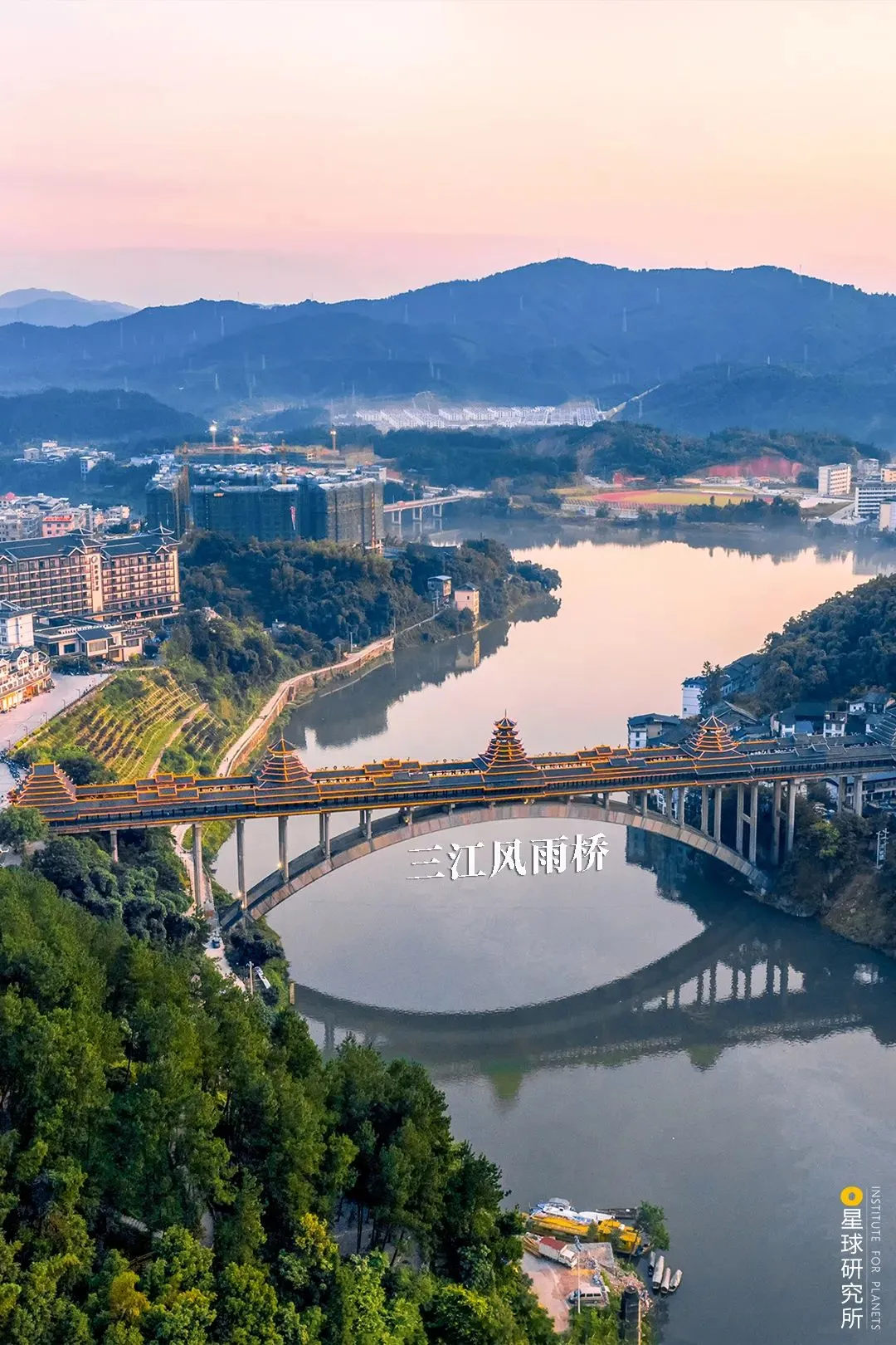 柳州三江地区村落多依山傍水,形成了“楼、廊、桥”等特色建筑;请滑动查看三江程阳风雨桥近景 | 摄影师@熊可&卢文