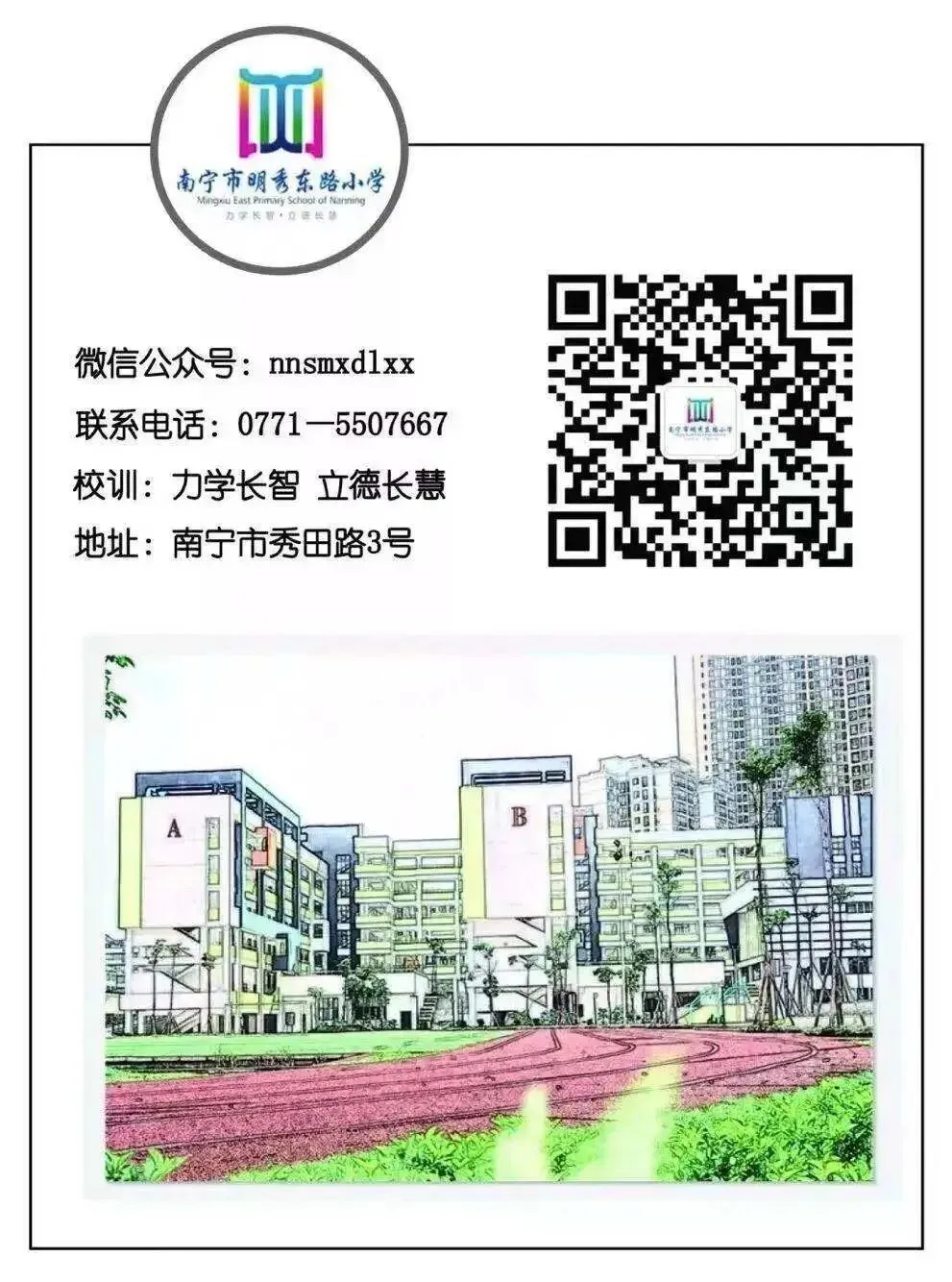 南宁市明秀东路小学始建于2015年8月,位于南宁市秀田路3号,毗邻美丽的狮山公园,隶属于南宁市兴宁区教育局;2025年7月,学校获批成立南宁市明秀东路小学教育集团,现拥有明秀东校区与泸田校区两个校区。在集团化办学部署下,办学规模稳步扩大,现共设有98个教学班,在读学生4904名;配备教职工290人,其中专任教师254名。