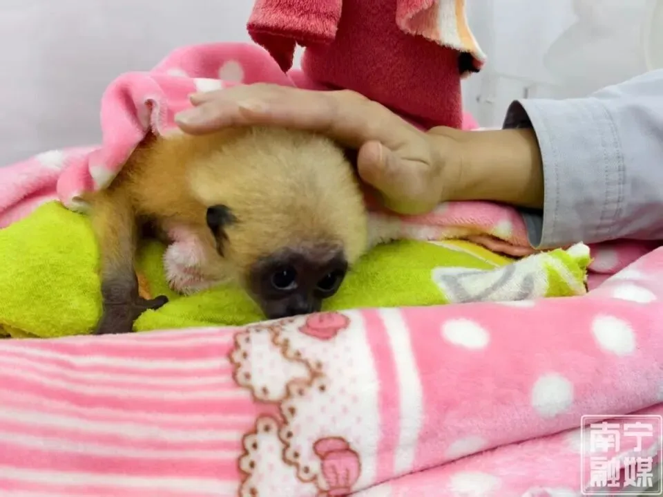 幼龄动物黑叶猴梧二裹着毛毯防寒保暖。