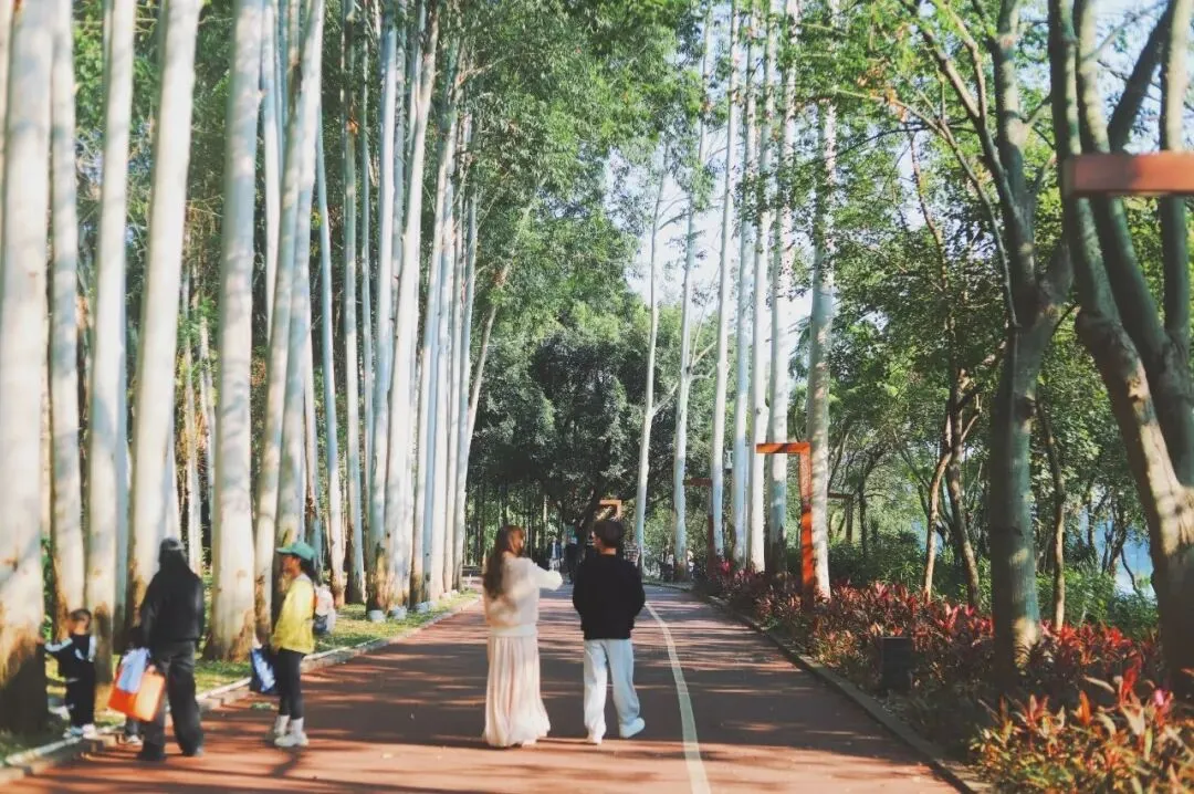 这里还有室内羽毛球场、篮球馆、气排球场等等,一到假期,还可以开启一个运动周末。沿着公园的小路走到江边,就可以看到网上超火的这片按树林。拿起手机随手一拍,翠绿的叶片、斑驳的阳光、笔直的树干,每一处细节都充满诗意,无需刻意构图,便是一张充满生命力的照片。