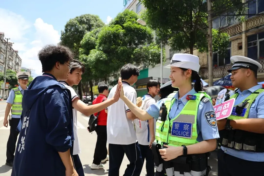 高考期间,在考场周围护航执勤的民警与学生击掌,为考生加油打气。