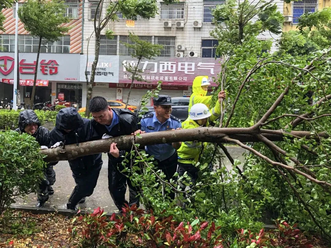 台风过境,派出所巡逻民警与交警一同清理倒伏树木,保障市民出行安全畅通。