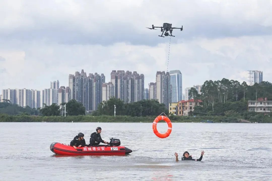 为应对汛期提升水上救援能力,防城港市公安局民警在相关海域开展水上救援拉练。