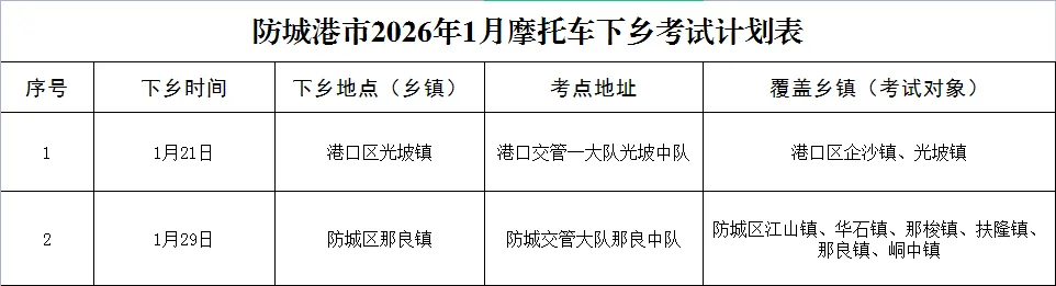 备注:摩托车驾驶人考试下乡服务时间原则上按以上计划实行,若遇不可抗力因素,极端恶劣天气或报名人数达不到开考条件等,防城港市公安局交通管理支队将调整部分计划并及时通告。