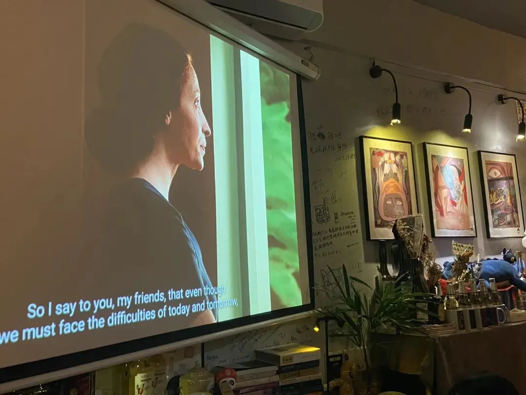 八点半,店里的人不是很多,我们得以坐在面向江景的小阳台,桌上摆放着台灯和绿植,留言卡铺满了一整张桌面。