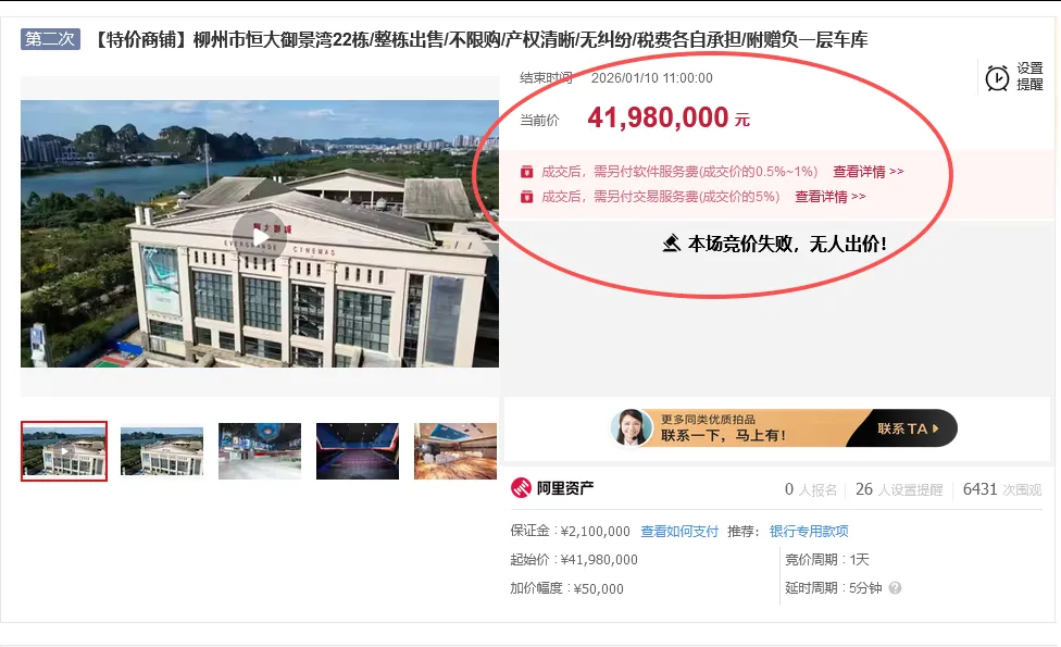 今日,即2026年1月10日,柳州市恒大御景湾22栋整栋楼结束了它的第二次挂牌拍卖。虽然与首次拍卖相比,二拍已经降价了差不多800万元,但仍然无人报名出价,最后以流拍告终。恒大御景湾22栋为何无人愿意接手呢?它是已经被市场抛弃了吗?据拍卖详情,恒大御景湾22栋并非司法拍卖,而是正常的商业资产交易行为。也就是说,是房主本人因为各种原因不想再继续持有了,自己主动拿出来拍卖变现。恒大御景湾22栋总建筑面积约12369.74㎡,在2025年12月6日,该22栋整栋楼就进行了首次公开拍卖。当时,首拍的起拍价格是4990万元,折合单价约4034元/㎡,但因无人报名竞价,首拍遭遇流拍。首拍流拍后,恒大御景湾22栋紧接着又二次上架拍卖,起拍价也降至了4198万元,相比首拍起拍价足足降低了792万,折合起拍单价仅约3394元/㎡。但没想到,恒大御景湾22栋二拍于2026年1月10日结束,最后仍以流拍告终。3394元/㎡的单价都流拍了,我的好朋友九伍二柒说他其实略感惊讶。这栋楼为什么无人愿意接盘呢?难道说它已经被市场抛弃了吗?恒大御景湾位于柳州市阳和开发区阳和大道和源路,占地面积约230亩。项目紧靠柳江河畔旁,环境比较优美,周边居民区和企业比较多。恒大御景湾22栋,即项目恒大影城所在楼栋,为地上4层,地下负一层,规划用途为影城、商业等。其1-4层产权面积总共12369.74㎡,附赠送负一层车库4090.04㎡共160个车位(使用权)。目前,恒大影城一楼二楼为毛坯状态,三四楼则已经全部装修完毕。其中三楼是售票大厅及影厅,共六个放映厅,一个VIP放映厅,一个观影厅,四楼则为放映机房及综合办公室。据拍卖标的物介绍,恒大御景湾22栋不存在查封情况,产权清晰,证件齐全,不存在交付困难的问题。不过目前存在抵押,抵押人为某商业银行,竞拍成交后,委托方办理撤押手续,不影响正常交易过户。我的好朋友九伍二柒认为,恒大御景湾22栋二拍流拍,是商业地产变现难、变现周期长的一个缩影。商业地产,尤其是类似恒大御景湾22栋这种大宗商业地产,现在市场的接受度非常低。首先,近年来楼市持续调整,实体行业变化,导致商业地产现在已经很不受人待见了;其次,大宗商业地产总价高,比如恒大御景湾虽然单价只有3千多元/㎡,但架不住体量大,总价高达4千多万。这种动辄千万元级别的大额交易,一般人没有这个资金实力,有这个资金实力的二般人在现时大环境下,也不敢轻易出手接盘。最后,商业地产的物业费非常高昂。类似恒大御景湾22栋,如果拍下来后无法有效盘活,每个月都要支出大笔的物业费,更令人望而生畏。从恒大御景湾22栋连续两次上架拍卖来看,持有人或许比较急于变现离场,后续可能还会继续降价拍卖。小伙伴们,你们觉得恒大御景湾22栋降价到什么程度,才会有人出手接盘呢?—-—这里是信息分割线—-—