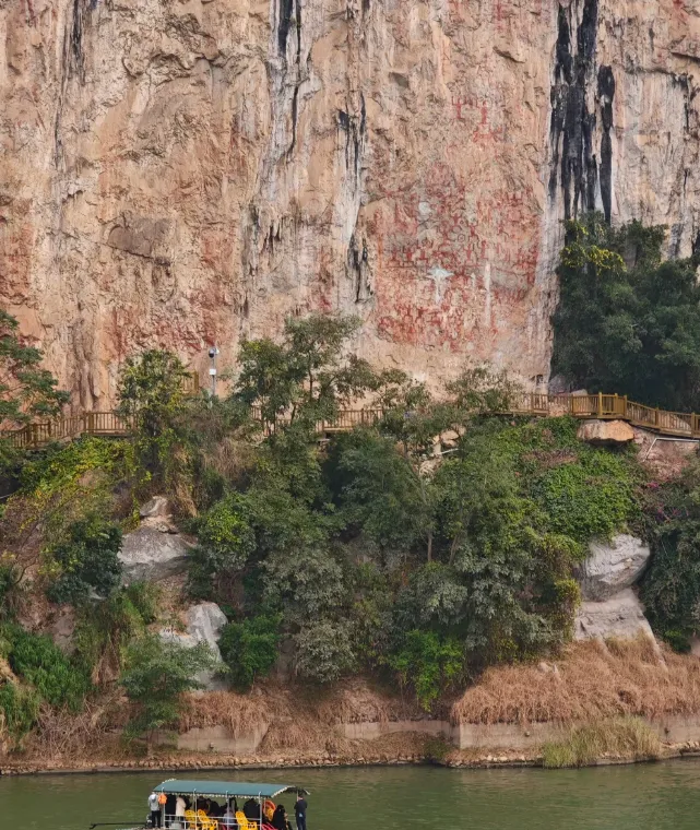 这不是普通的画展,而是一部刻在悬崖上的无字天书。坐船行在左江上,两岸青山如黛,一抬头,就能看见那些赭红色的图案。