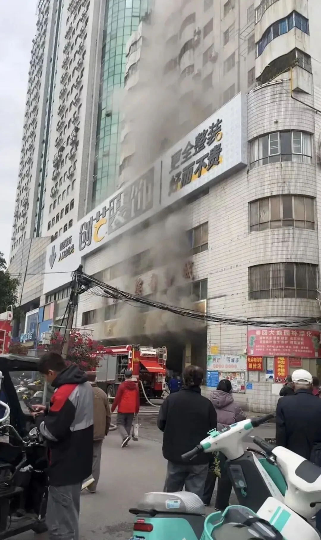 现场视频画面显示,有黑烟不断从该电器城冒出,消防车辆正开展相关灭火作业。