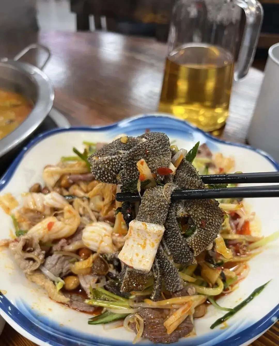 新实惠牛杂火锅必须去 , 天梯一定要点 , 脆脆的口感很上头。 记得选酸辣或者油辣味碟 , 很有特色。