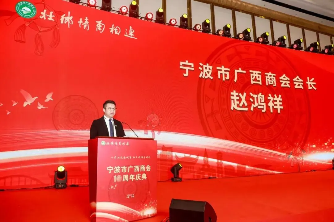 庆典伊始,宁波市广西商会会长赵鸿祥发表热情洋溢的致辞。他深情回顾了商会十年深耕甬城的发展征程——从最初的同乡联谊小团体,逐步成长为立足港城、辐射长三角的多元化服务平台,累计服务会员企业300余家,促成跨区域合作项目50余项,不仅成为在甬桂商最温暖的“娘家”,更成为桂甬两地经济文化交流的重要桥梁。致辞中,会长特别致谢各兄弟商会长期以来的鼎力支持,强调桂商精神的核心在于“抱团取暖、互助共赢”,未来将持续深化与各地商会的联动,让壮乡情谊在港城大地上愈发深厚,为两地发展注入更强劲的桂商力量。