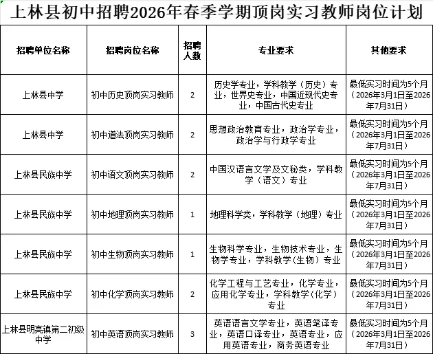 上林县初中学校招聘2026年春季学期顶岗实习教师公告