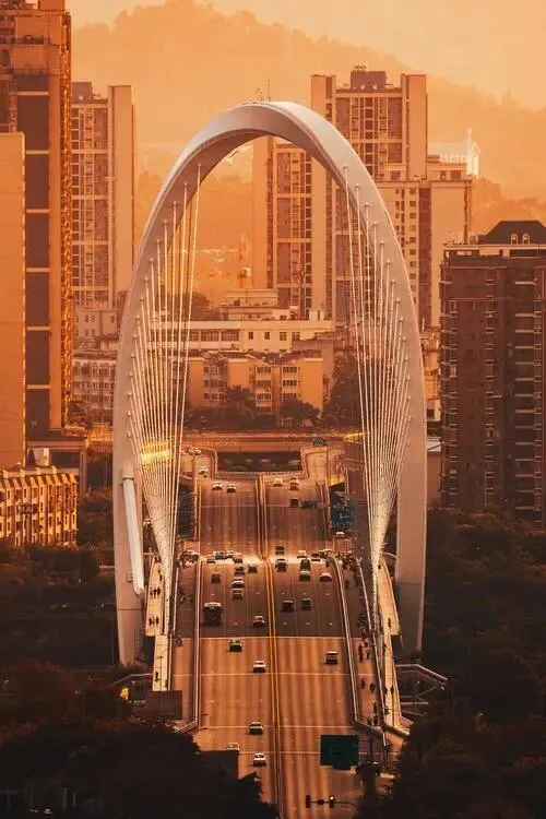 日落从文昌大桥两边看,江面起金光,桥拱像一串弯月。