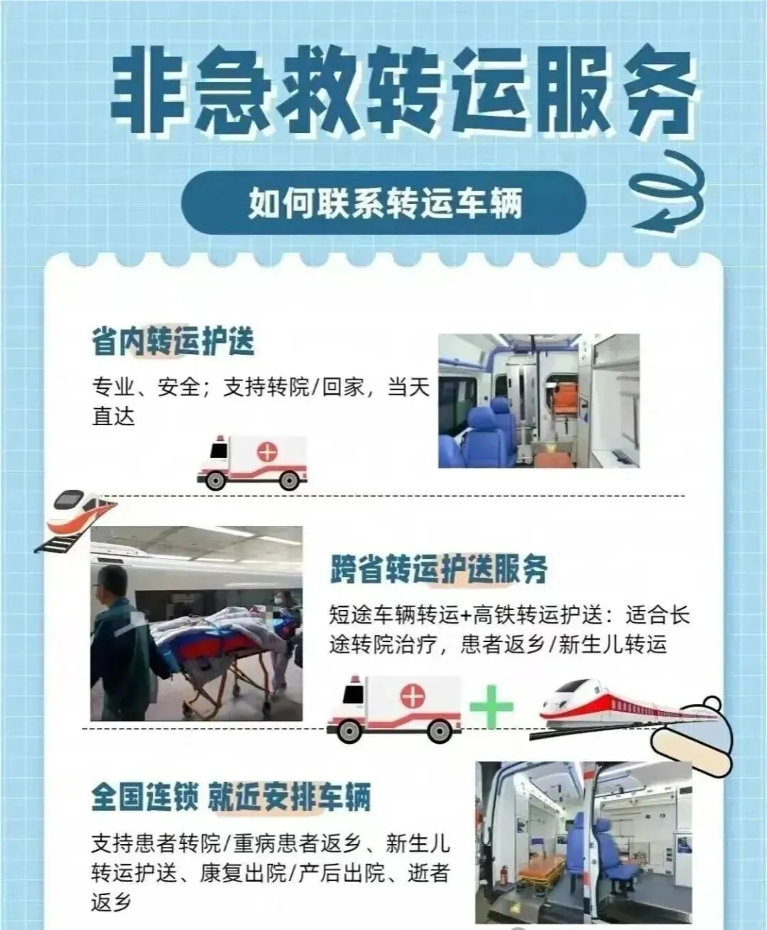 跨城看病、康复返乡需求日增,专业救护车出租转运已成生命安全好帮手。无论重症跨省转院、术后返乡,还是突发疾病急救,靠谱救护车可顺利打通安全生命通道,全程安心。