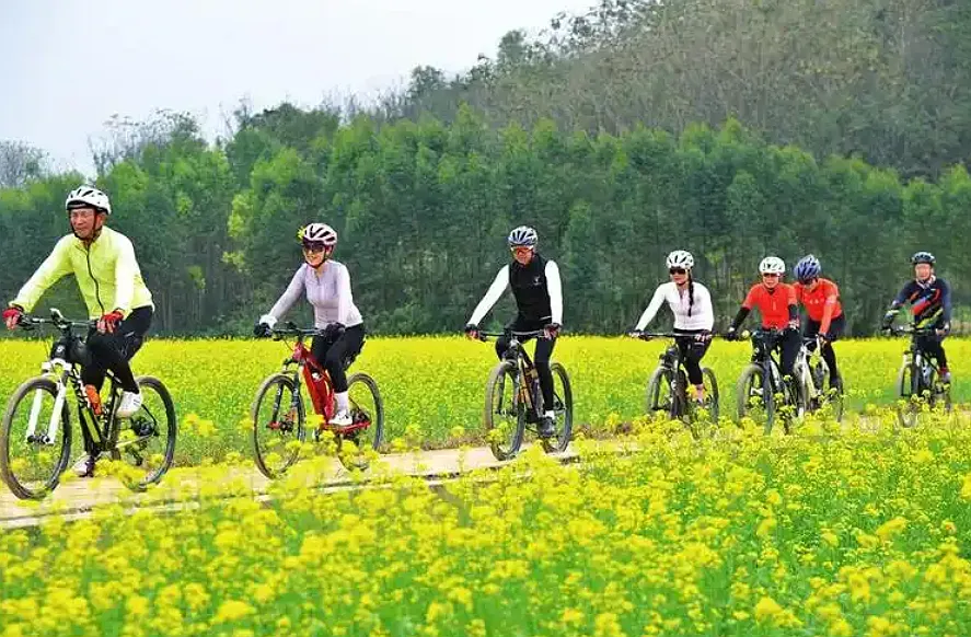 南宁市青秀区长塘镇天堂村的油菜花,是邕城冬日里最绚烂的亮色。这里成片的油菜花竞相绽放,花色金黄透亮,尽显蓬勃生机。蓝天白云的映衬下,一朵朵、一串串油菜花迎着暖阳肆意舒展,微风轻拂时,花穗摇曳生姿,阵阵清香随风飘散,整片花田泛起层层金色波浪,连绵起伏的花海与远处的村落、蜿蜒的邕江、穿梭的火车及周边的青山绿水相映成趣,勾勒出一幅诗意盎然的乡村画卷。游客们循着花香而来,漫步在花海步道间,或驻足拍照打卡,或闭眼轻嗅花香,尽情沉醉于田园浪漫;骑行爱好者则沿着花田边缘的道路穿梭前行,灵动的身影成为花海中一道独特的风景线。花海旁藏古韵