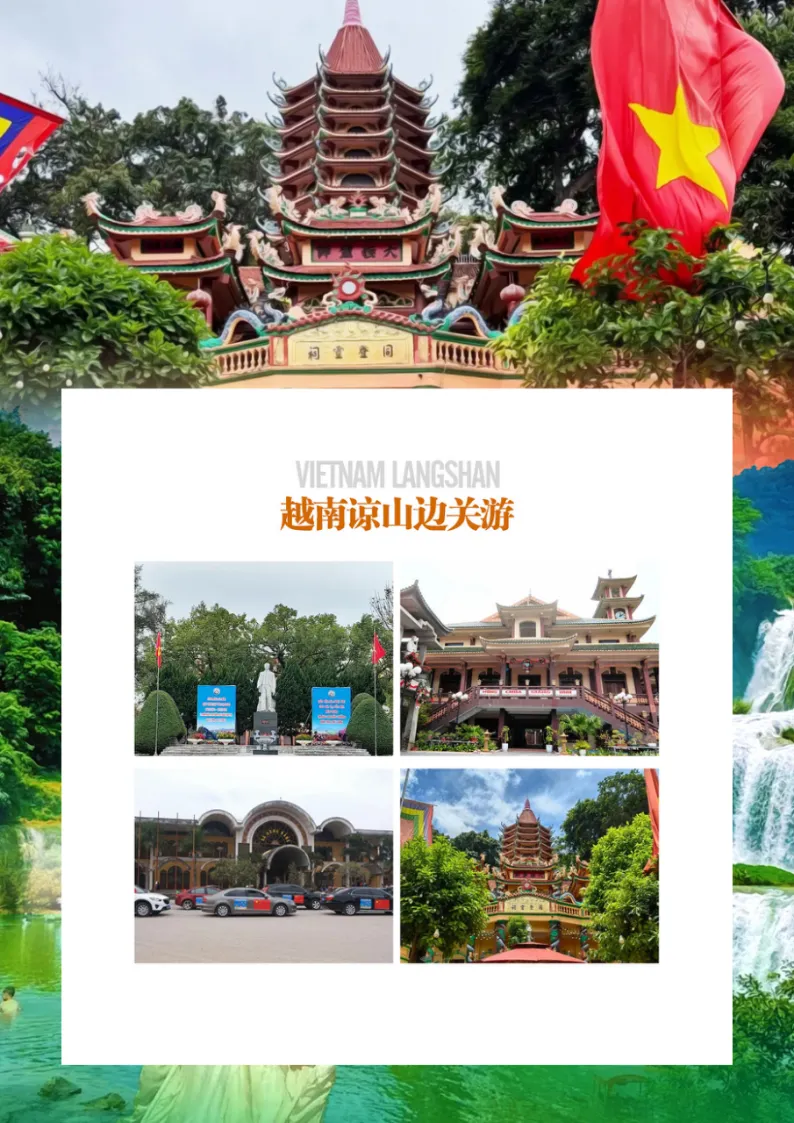 入境越南后,乘坐电瓶车到越南口岸停车场,换乘旅游车前往越南谅山同登镇(车到越南停车场,换乘旅游车前往越南谅山同登镇(约10分钟),参观【同登灵寺】(游览约30分钟),已有300多年历史,寺庙属于典型的中国传统建筑,每年正月初十的庙会非常热闹。