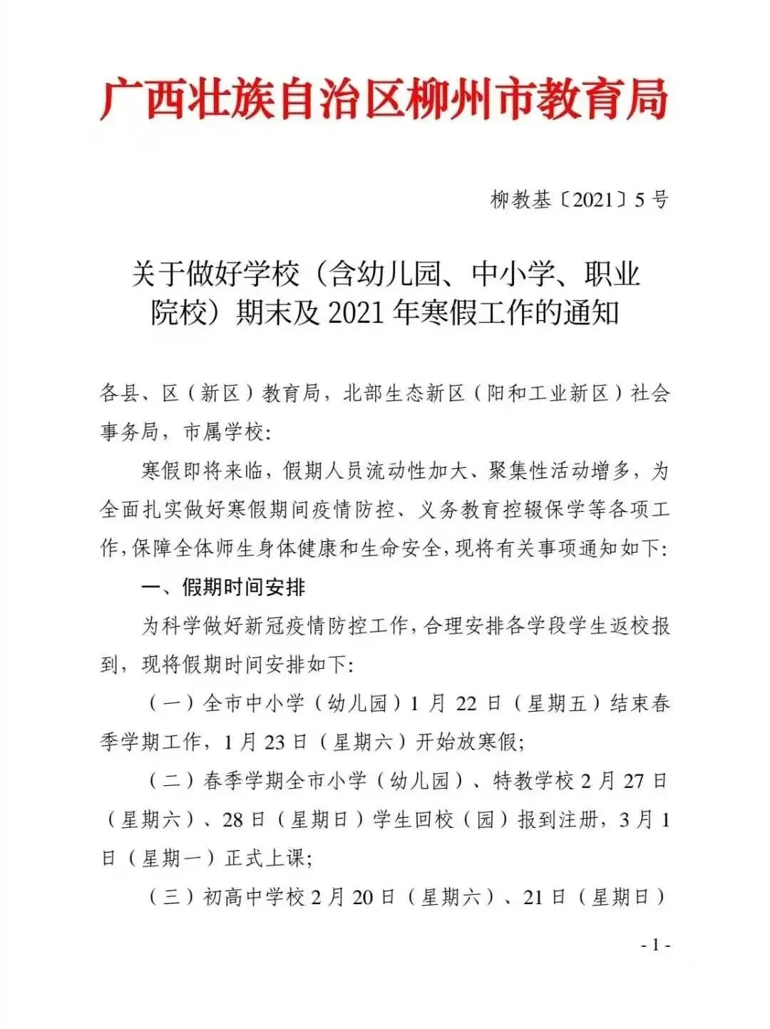 近日,柳州市教育局发布《关于做好学校(含幼儿园、中小学、职业 院校)期末及 2021 年寒假工作的通知》(以下简称《通知》),各相关单位对寒假期间疫情防控、义务教育控辍保学等各项工作要做好妥善安排。