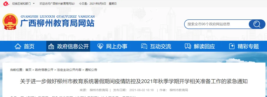 8月2日,柳州市教育系统新型冠状病毒感染的肺炎疫情防控工作领导小组发布《关于进一步做好柳州市教育系统暑假期间疫情防控及2021年秋季学期开学相关准备工作的紧急通知》,明确即日起,教育系统干部、教职员工、学生非必要不离柳不离桂,减少不必要的研学、交流、参观活动;原则上各级各类学校及幼儿园教职员工、学生在秋季学期开学前14天返柳;着重做好12~17 岁人群疫苗接种工作,确保符合接种条件的人员“应种尽种”。