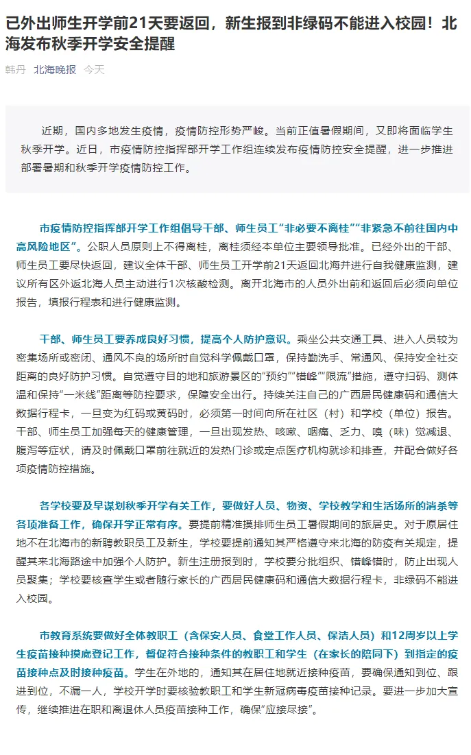 各市对师生返回本地的时间也作出了明确要求,例如北海市建议已外出师生开学前21天要返回,新生报到非绿码不能进入校园。