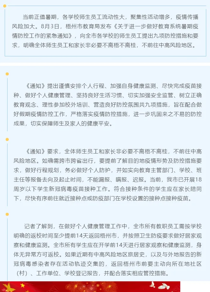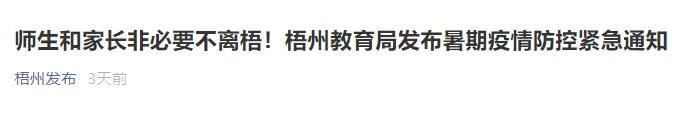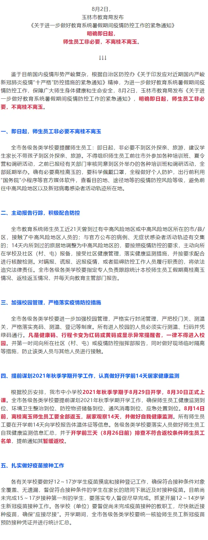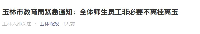 8月2日,玉林市教育局发布《关于进一步做好教育系统暑假期间疫情防控工作的紧急通知》,明确即日起,师生员工非必要,不离桂不离玉。