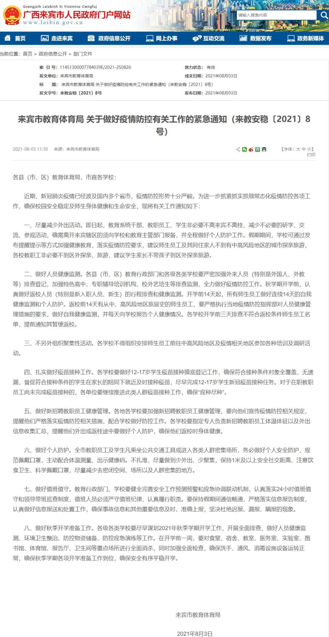 8月2日,来宾市教育体育局发布《关于做好疫情防控有关工作的紧急通知》做好人员健康监测。要求秋学期开学前,认真做好返校人员(特别是新入职人员、新生)的行程排查和健康监测。