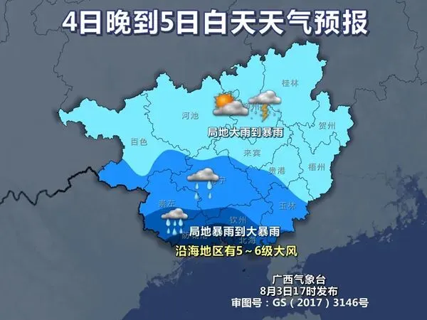 4日晚上到5日白天,沿海和桂南部分地区有中到大雨、局地暴雨到大暴雨,我区其它地区多云有阵雨或雷雨、局地大雨到暴雨。沿海地区有5~6级大风。