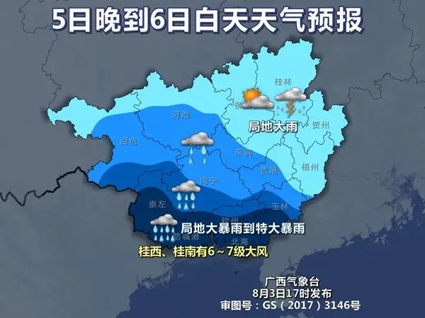 5日晚上到6日白天,桂南、桂西部分地区有大雨到暴雨、局地大暴雨到特大暴雨,我区其它地区多云有阵雨或雷雨、局地大雨。桂西、桂南有6~7级大风。