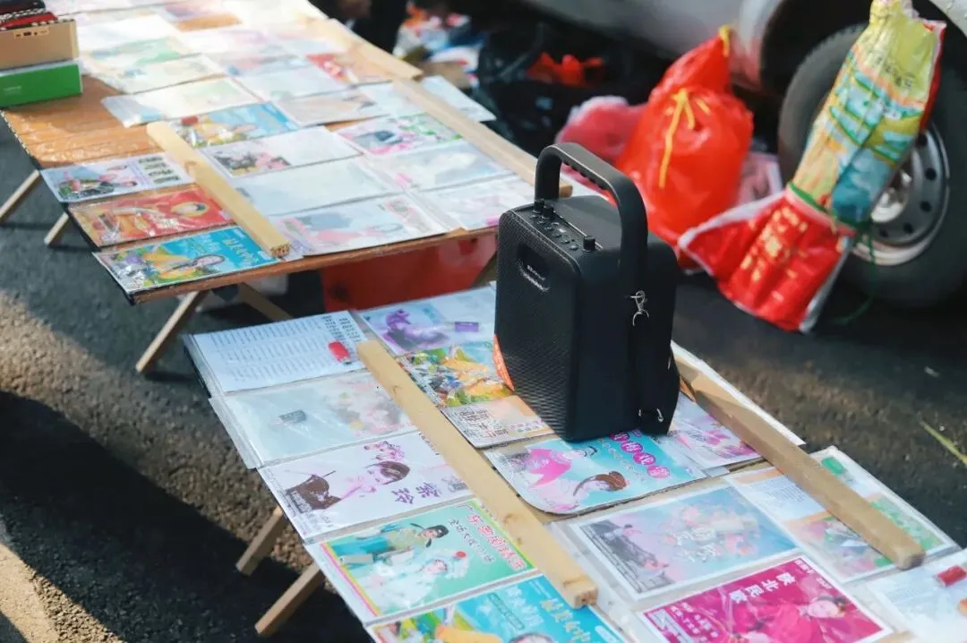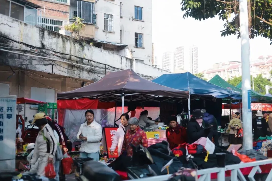 摩肩接踵的人们从四面八方赶来,有推着小推车的阿姨,大家脸上都带着期待的笑容,在摊位间穿梭往来。