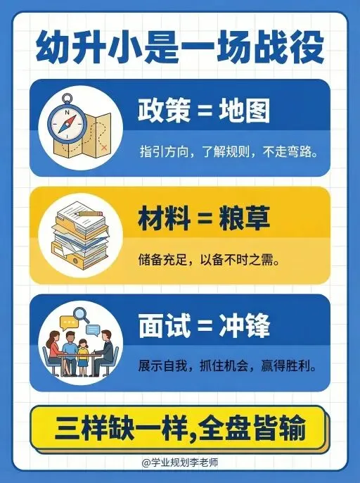 如果幼升小是一场战役,那政策就是地图、材料就是粮草、面试就是最后的冲锋。三样缺一样,全盘皆输。