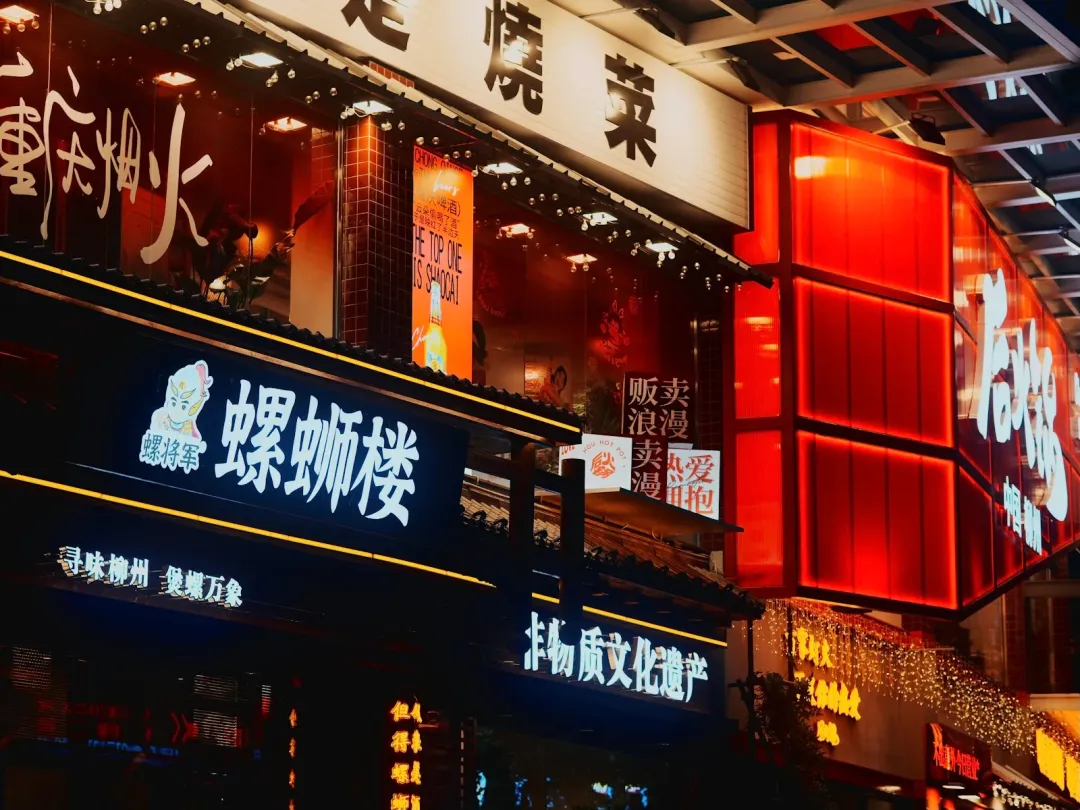 炫目的霓虹灯为街道注入活力。高耸的建筑群,特别是造型独特的“螺蛳楼”,闪耀着光芒,勾勒出柳州集商业、历史与现代生活于一体的城市肌理。