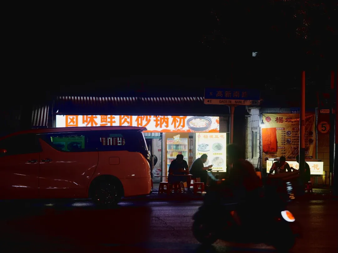这里的气氛,与螺蛳粉的汤底一样浓郁。附近餐馆,一群人分享着美食,他们的笑声与街头喧嚣交织,构成一幅生动的夜景。城市的脉动在发动机的低沉轰鸣中继续。我们欣赏了一辆宽胎摩托车,看着一对情侣骑车疾驰而过。甚至在那辆摩托车上,我们发现了那个叛逆的骷髅装饰——这些微小而充满活力的闪光点,组成了柳州夜晚的独特魅力。