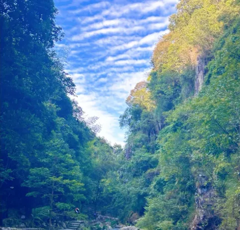溪水随着谷床的变化成潭、成湾、成瀑布;谷道两岸茂林修竹簇拥,危崖中闲。