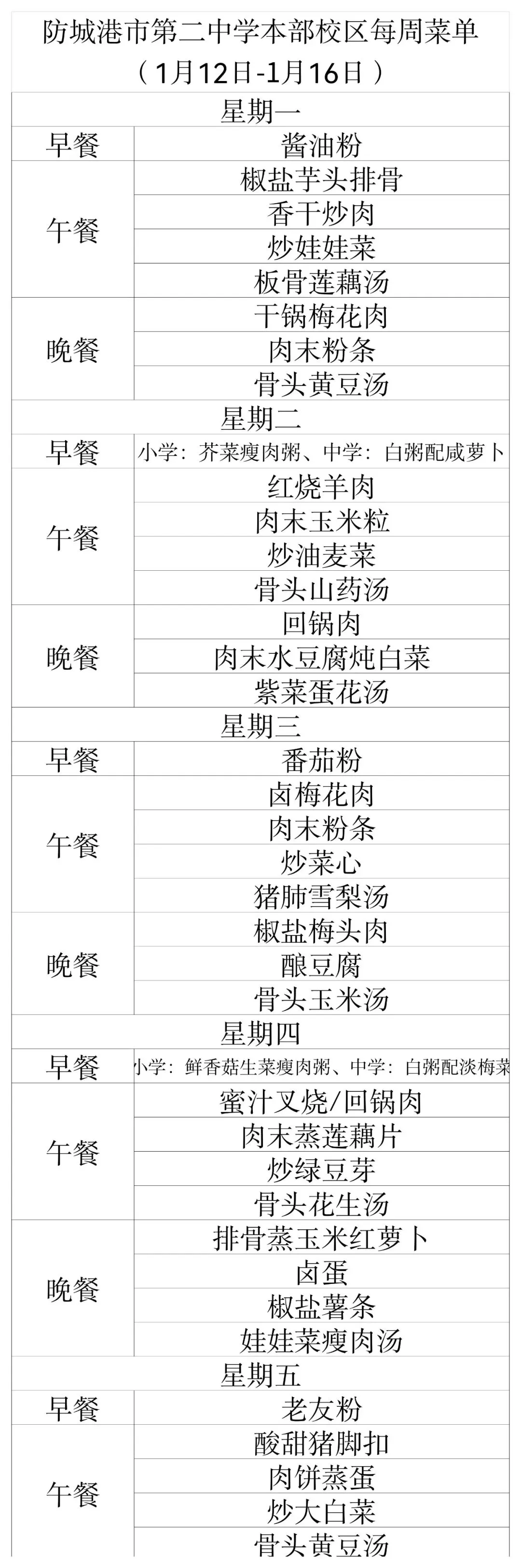 防城港市第二中学每周菜单(2026年1月12日-16日)