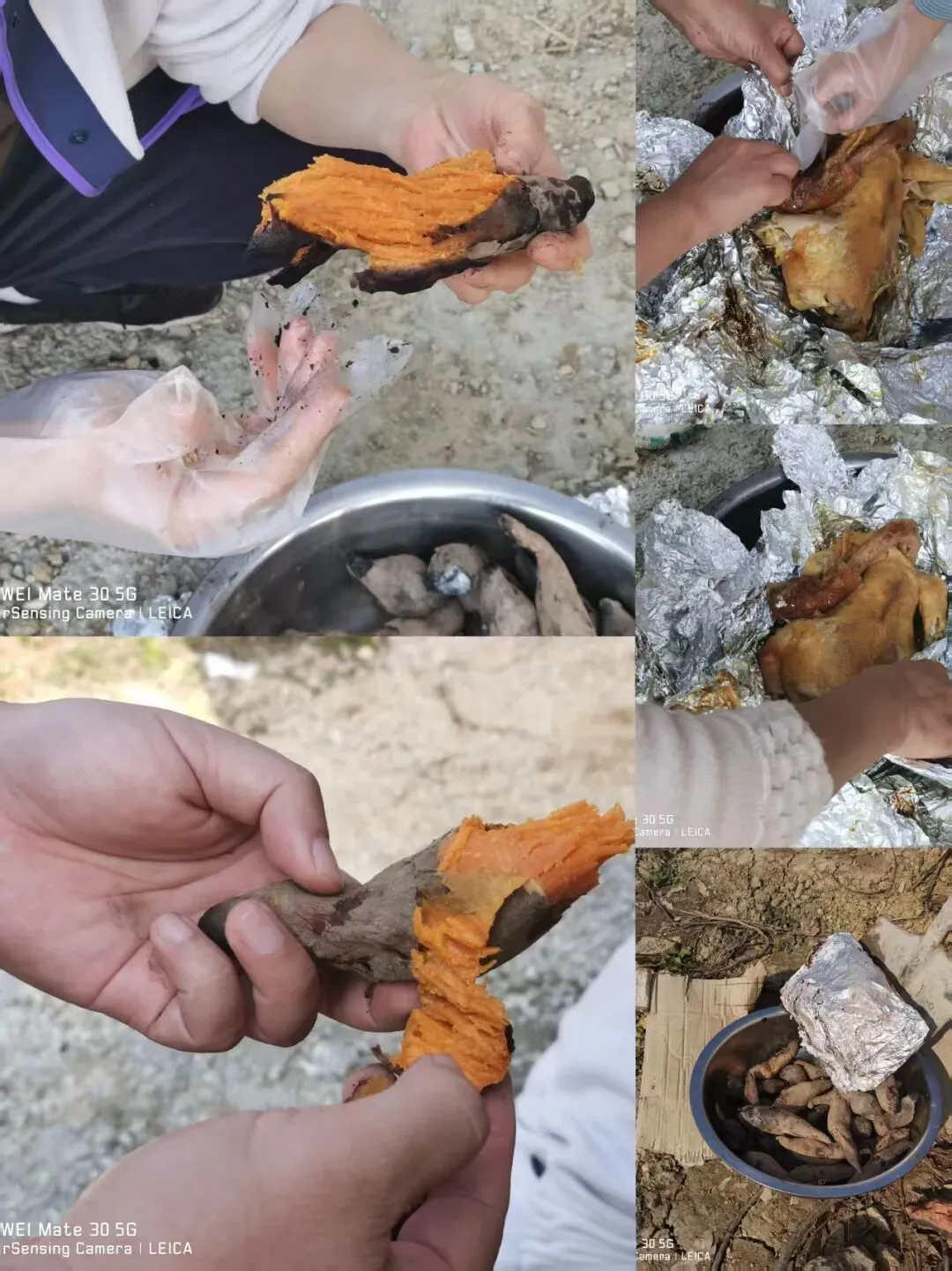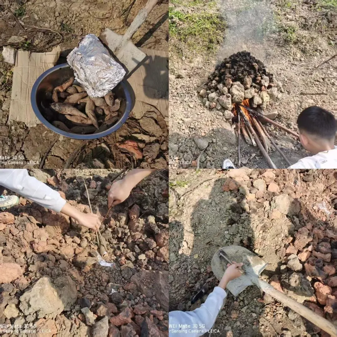想起我小时候第一次尝试,堆到老高却迟迟合不了顶,最后只能推倒重来。这过程,考验的是耐心,锻炼的是动手能力,更是孩子与自然合作的初体验。窑火升起,泥块渐渐烧得通红。把用锡纸仔细包好的鸡、红薯、芋头一一放入窑中,接下来便是孩子最爱的环节——打窑!大家拿起木棍,使劲捶打热乎乎的泥块,让窑体更密实。后来干脆直接跳上去,在窑顶蹦蹦跳跳,像在玩一座温暖的泥土蹦床,欢笑声中夹杂着“小心别让热气跑掉”的提醒。等待,总是值得的。窑熟开盖的那一瞬,热气裹挟着红薯的甜香与鸡肉的鲜嫩扑面而来——那是劳动馈赠的滋味,格外香甜。2. 田园间隙:喂兔、赶鸡、小野战