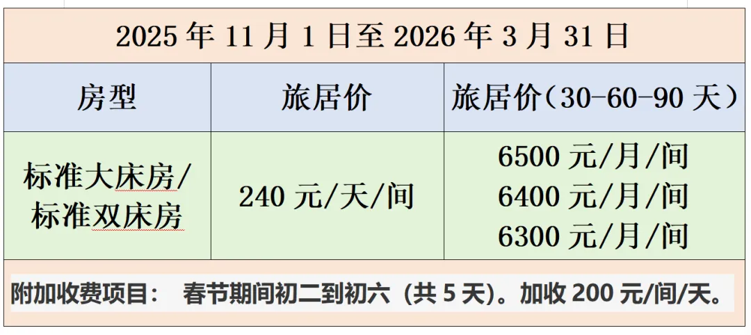 温馨提示:专属优惠旅居价需联系北海市候鸟服务中心预订,需要订房的朋友们,直接联系我就能锁定心仪房间,省心又省力。注:以上报价含2人三餐,连住2天起订,一个人住每天减30元。春节期间初二到初六(共5天)。加收200元/间/天。1.长期住客可享每周1次免费床品换洗、24小时客房应急响应服务。