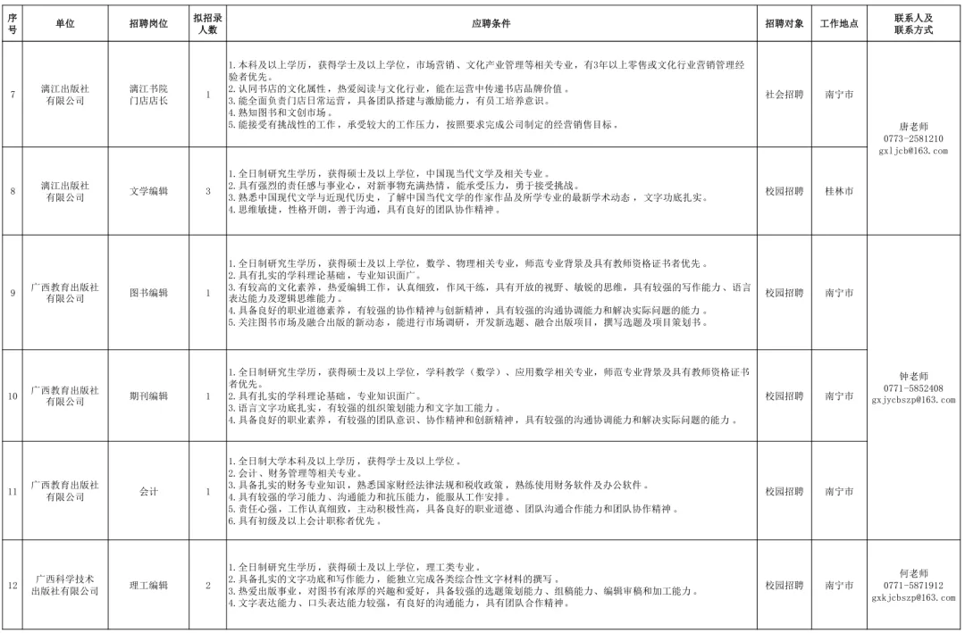 请应聘人员将《广西出版传媒集团有限公司应聘报名表》(附件2)、《广西出版传媒集团有限公司应聘人员名册》(附件3)发送到附件1相应单位联系人的邮箱,邮件统一命名为“应聘公司+应聘岗位+姓名”,比如“广西人民出版社有限公司+图书编辑+张三”。不按要求填写及提交报名表、应聘人员名册的视为无效报名。