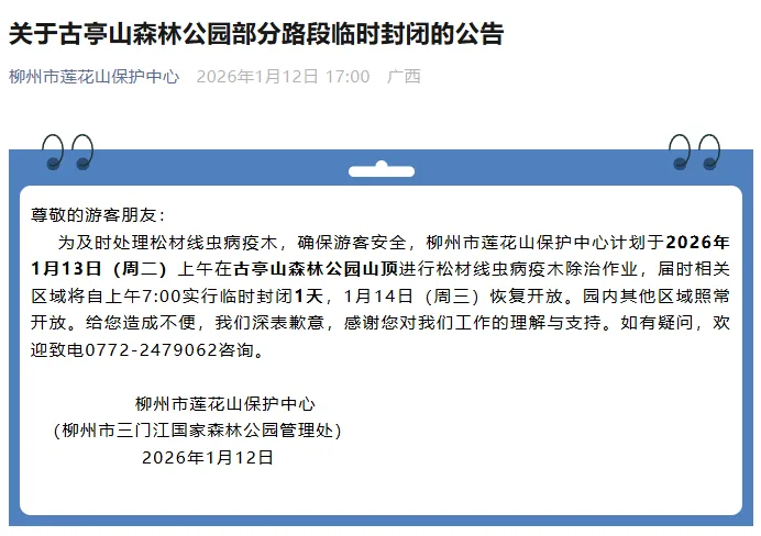 1月12日,柳州市莲花山保护中心发布《关于古亭山森林公园部分路段临时封闭的公告》,内容提到,柳州市莲花山保护中心计划于1月13日(周二)上午在古亭山森林公园山顶进行松材线虫病疫木除治作业,届时相关区域将自上午7:00实行临时封闭1天,1月14日(周三)恢复开放。园内其他区域照常开放。
