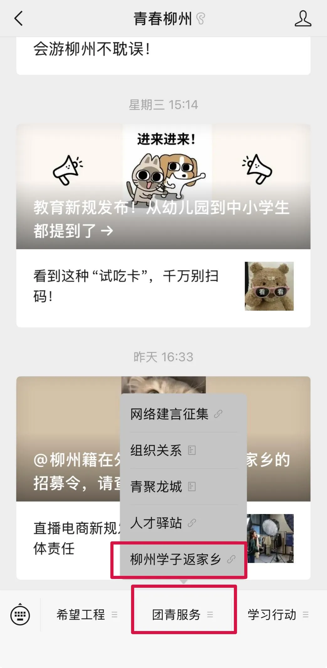 点击关注后,来到主菜单页面,打开“团青服务”菜单栏后点击“柳州学子返家乡”。
