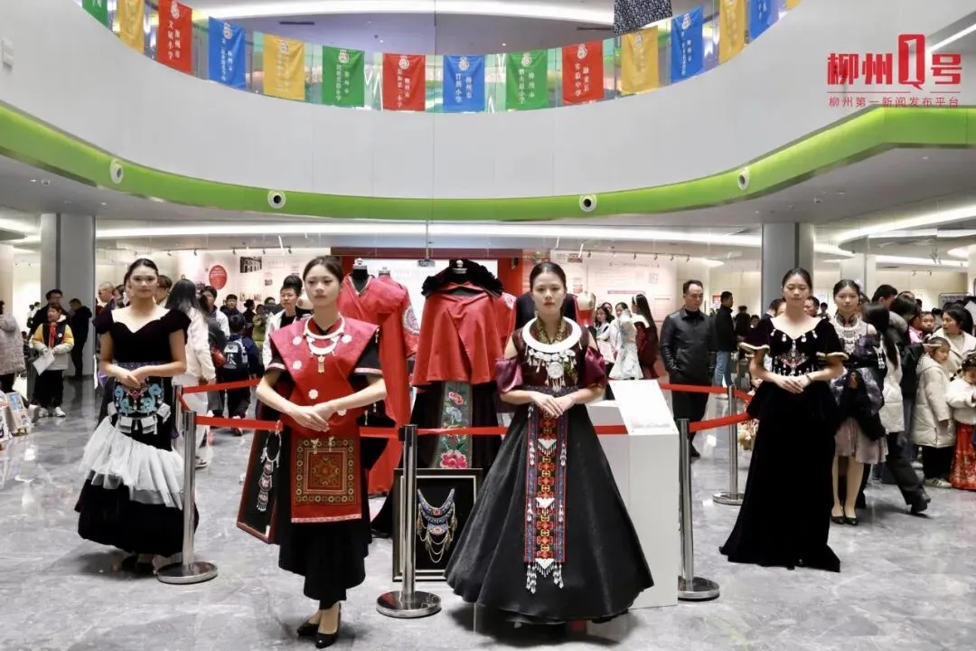 展览现场还设置了VR博物馆体验、民族服饰展、非遗体验课、爱心集市等互动环节。柳州市第二职业技术学校师生现场展示了民族服饰制作与创新设计成果,将侗族服饰与现代时尚相融合,生动体现了少数民族技艺的传承创新。