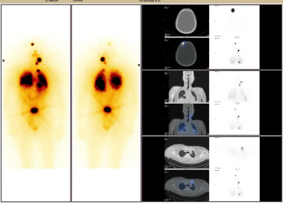 令人意想不到的是,张阿姨服碘-131治疗后进行的碘-131全身显像检查,竟然又发现新病灶:除了甲状腺床区域、双肺及第四椎体均出现放射性浓聚异常灶,颅脑右侧发现一个2公分大小的病灶,这一结果提示张阿姨存在脑转移——这是之前未发现的“隐藏病灶”。