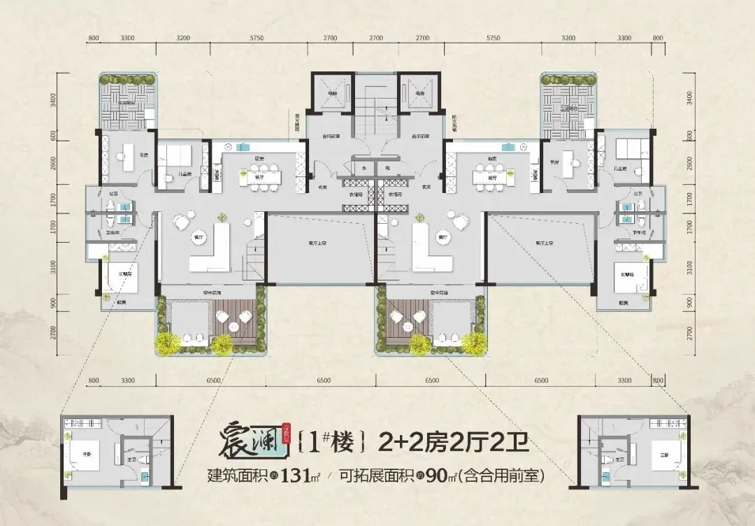 该户型建面约131m²,可拓展面积能达到约90m²。