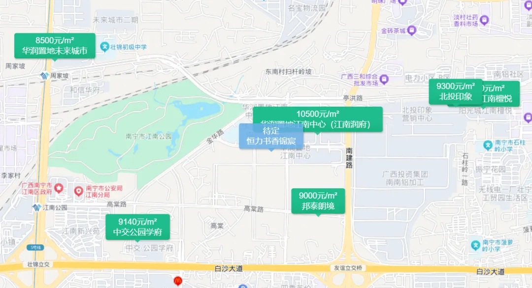 从项目看,华润置地江南中心/江南润府、中交公园学府、邦泰朗境、北投印象、未来城市等在售楼盘都在周边。
