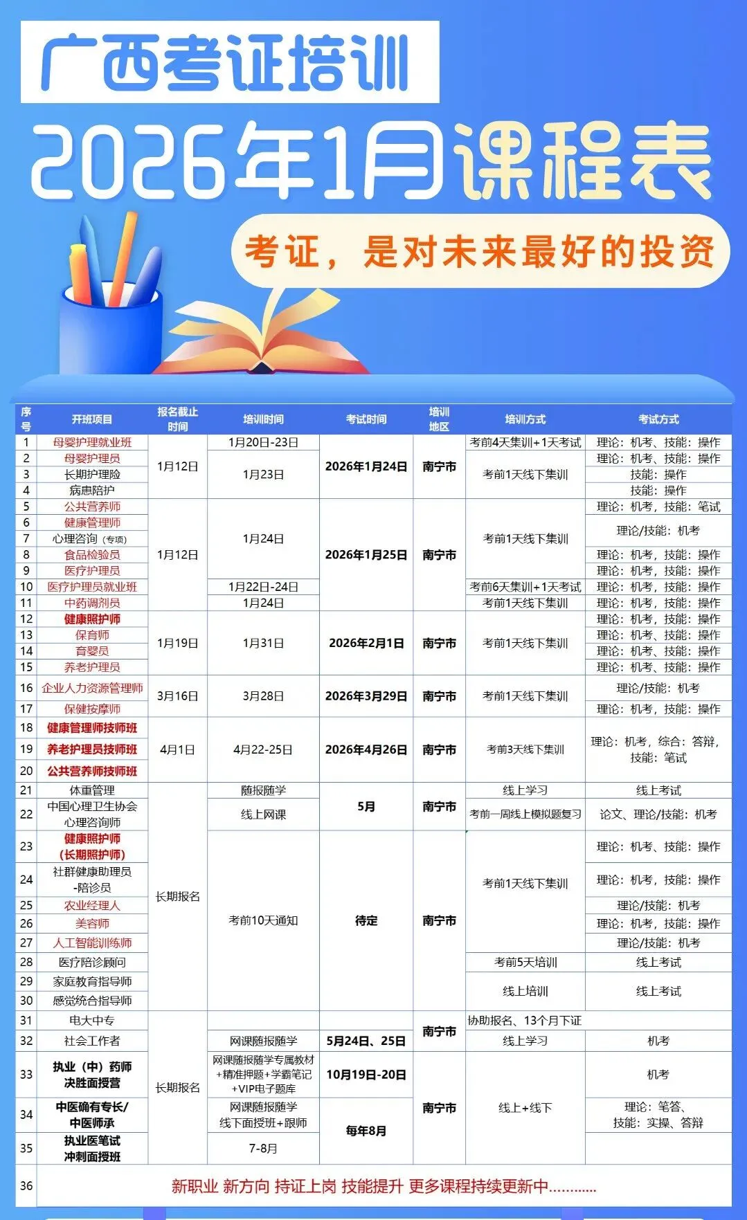 保育师、育婴员、母婴护理员(月嫂)、医疗护理员(护工)、心理辅导专项能力、健康管理师、公共营养师、养老护理员、食品检验员、中药调剂员、企业人力资源管理师等职业技能等级证考证培训,符合条件拿证后可申请1000-2000元政府补贴!
