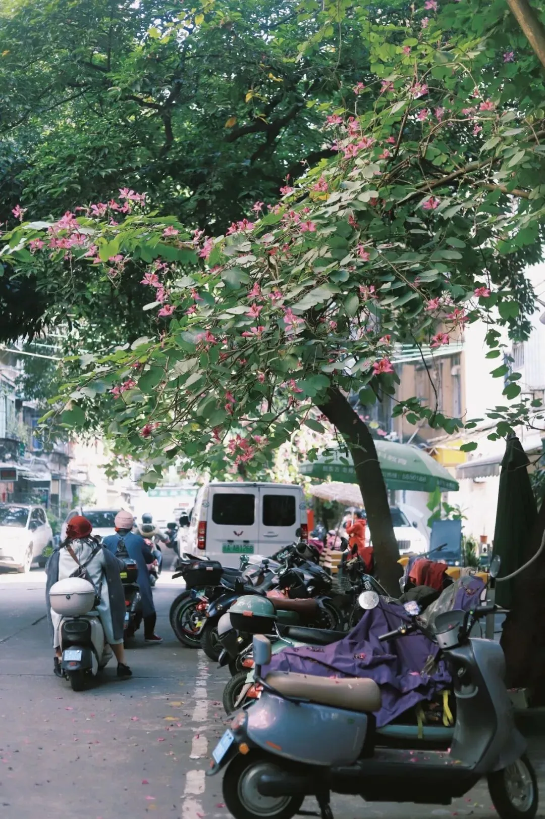 道路两旁的老树伸展着茂密的枝叶,在柏油路上投下斑驳的光影,风吹过树叶沙沙作响,像是在诉说着老南宁的故事。